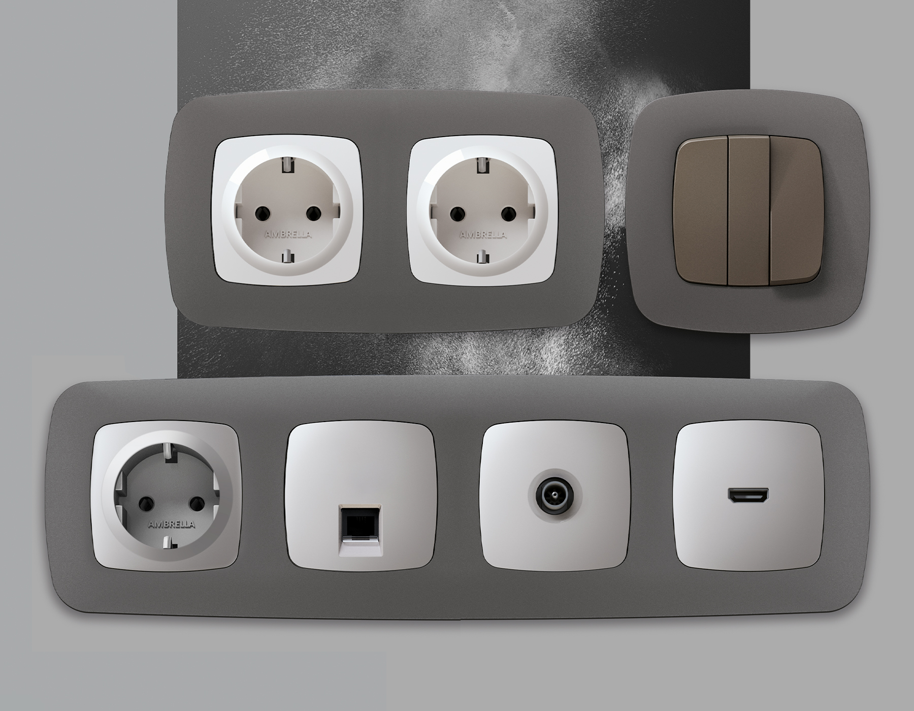 Многогранный ассортимент Ambrella Volt включает в себя механизмы, лицевые панели и рамки, а также комплекты, доступные в различных цветовых решениях. Продукция представлена в модульном исполнении, что позволяет гибко настраивать внешнийвид и функциональность. Вам будет легко заменить лицевую панель, рамку или механизм, найдя идеальное сочетание цветов.