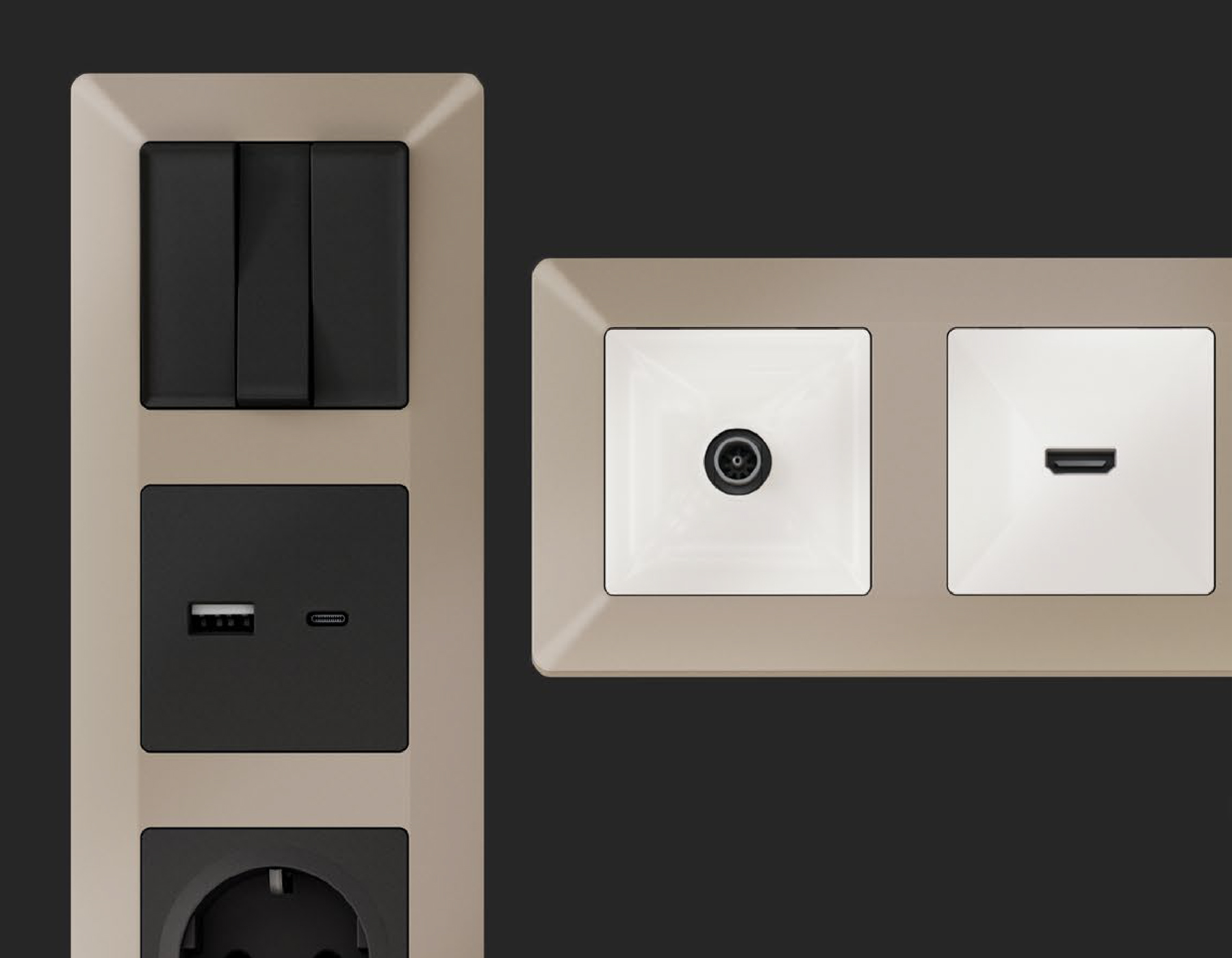 Многогранный ассортимент Ambrella Volt включает в себя механизмы, лицевые панели и рамки, а также комплекты, доступные в различных цветовых решениях. Продукция представлена в модульном исполнении, что позволяет гибко настраивать внешнийвид и функциональность. Вам будет легко заменить лицевую панель, рамку или механизм, найдя идеальное сочетание цветов.