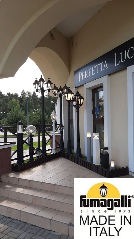 Садовый светильник-столбик FUMAGALLI серии RUT, модель RUT/ALOE.R. Столбик освещения ALOE.R и светильник RUT. Используются для архитектурного и ландшафтного освещения в стиле "классика". Место установки столбиков освещения - парковые дорожки, тротуары, газоны в парках и скверах, а так же ландшафтные и архитектурные объекты. Изготовлены в Италии, по уникальным технологиям "FUMAGALLI" из современного композитного полимера RESIN. Этот материал в 5 раз прочнее металла, не ржавеет, не окисляется, не выгорает на солнце, его не нужно красить. Все светильники пыле-влаго защищены по стандарту IP55 (Пылезащищенные, защита от водяных струй с любого направления). Рассеиватель выполнен из антивандального, не мутнеющего и не горючего PMMA (ПолиМетилМетаАкрилат). Срок службы светильника - не менее 20 лет. Температура использования от -60 до +90. В серии RUT есть фонари в настенном (BISSO/ RUT, OFIR/ RUT, MIRRA/ RUT, PORPORA/ RUT) подвесном (SICHEM/ RUT) и наземном исполнении (MINILOT/ RUT, MIZAR.R/ RUT, IAFAET.R/ RUT, ALOE.R/ RUT, ARTU/ RUT, GIGI/ RUT, RICU/ RUT, RICU/ISSO/ RUT 2L, NEBO/ RUT, NEBO OFIR/ RUT 2L, NEBO OFIR/ RUT 3L) со столбами разной высоты, с разным количеством и конфигурацией голов. Консоли настенных фонарей и кронштейны светильников на столбах освщения могут устанавливаться вверх/вниз. Столбы выше 150 см имеют в основе мощную стальную трубу с двойной оцинковкой. При заказе требуется выбрать цвет корпуса, цвет плафона и тип патрона. По стилю и дизайну серия уличных светильников RUT похожа на светильники малого размера серии ANNA и на светильники большого размера серии NOEMI. По размеру RUT относится к средним светильникам как серия CEFA, SALEM и GLOBE 300.