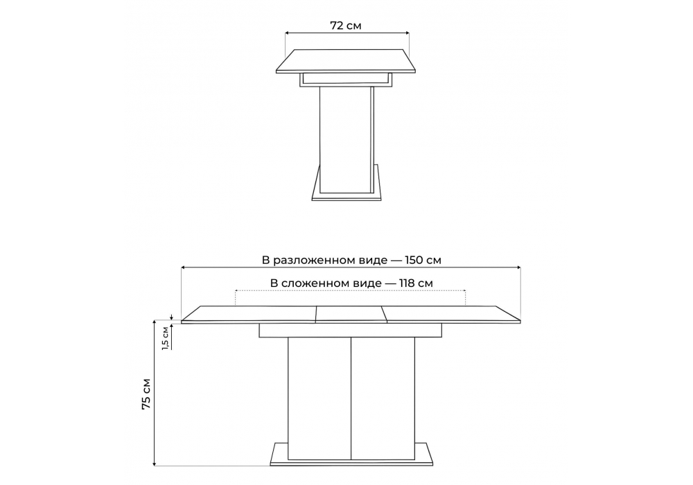 Материал каркаса - ЛДСП; Материал столешницы - ЛДСП; Ширина - 72,5; Высота - 75,5; Длина стола в разложенном виде - 150; Длина - 118;
