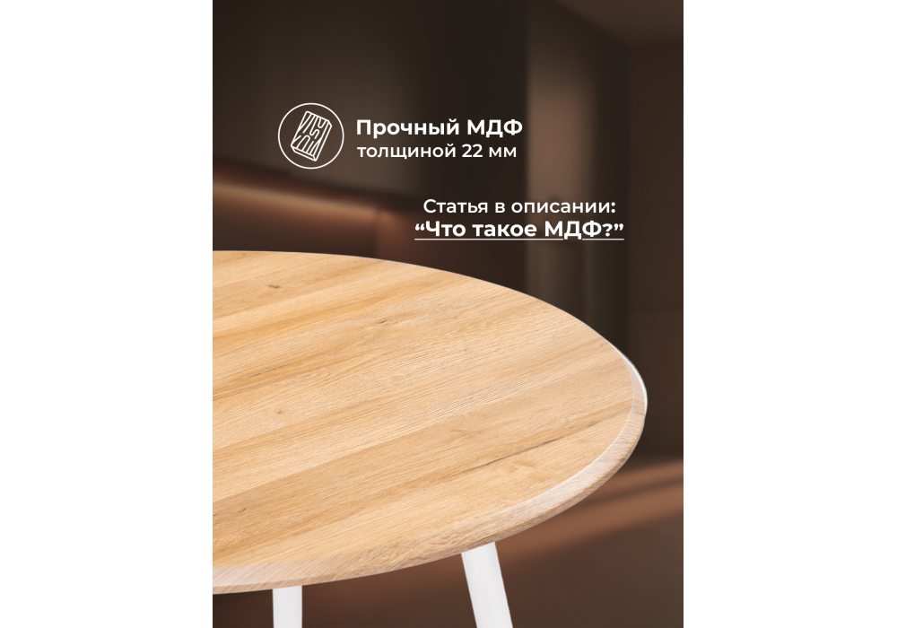 Толщина столешницы: 2,2 см. Материал каркаса - металл; Материал столешницы - МДФ; Цвет ножек - белый; Ширина - 90; Высота - 76; Длина - 90;
