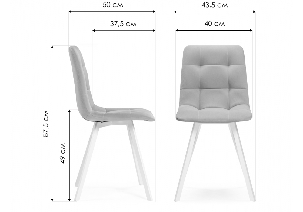 Материал каркаса - металл; Материал сиденья - велюр; Материал обивки - велюр; Цвет ножек - белый; Ширина - 43,5; Глубина - 50; Высота - 87,5; Ширина сиденья - 40; Глубина сиденья - 37,5; Высота сиденья - 49;
