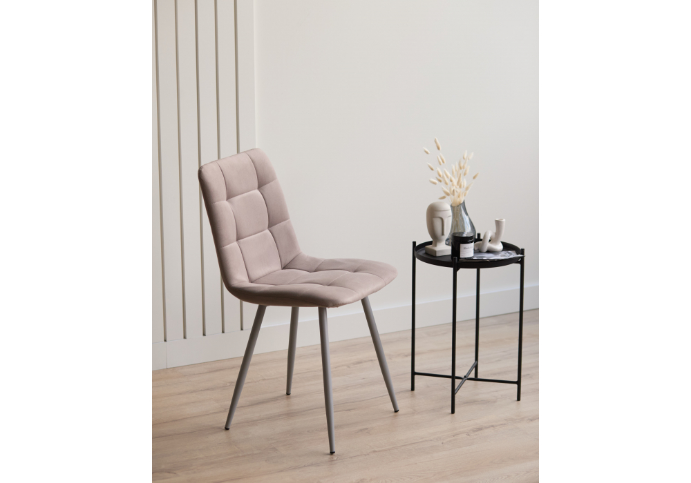 Материал каркаса - металл; Материал сиденья - велюр; Материал обивки - велюр; Цвет ножек - серый; Ширина - 43,5; Глубина - 50; Высота - 87,5; Ширина сиденья - 40; Глубина сиденья - 37,5; Высота сиденья - 49;