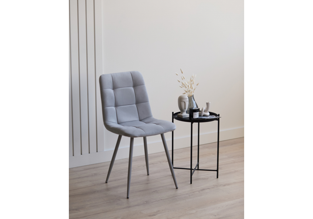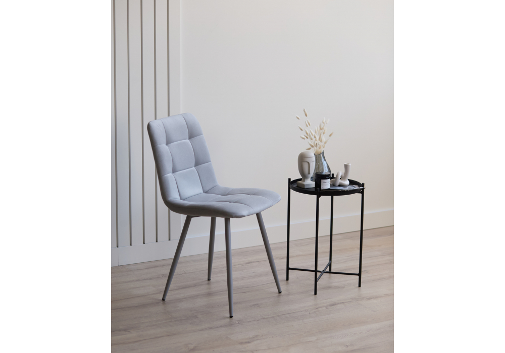Материал каркаса - металл; Материал сиденья - велюр; Материал обивки - велюр; Цвет ножек - серый; Ширина - 43,5; Глубина - 50; Высота - 87,5; Ширина сиденья - 40; Глубина сиденья - 37,5; Высота сиденья - 49;
