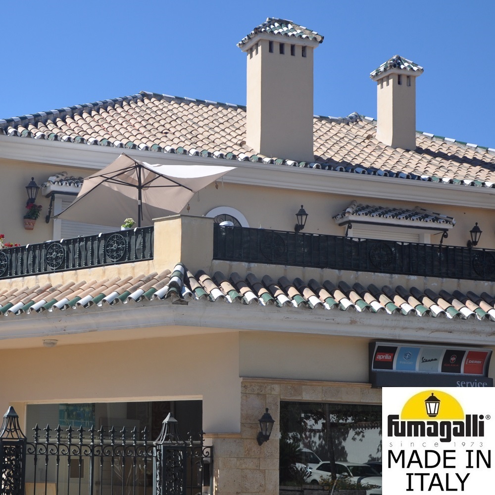 Светильники уличные настенные FUMAGALLI серии RUT, модель RUT/BISSO. Консольный уличный светильник для монтажа на стену. Настенный кронштейн BISSO малого размера и светильник RUT. Монтаж фонаря "вверх". Используются для фасадного и архитектурного освещения в стиле "классика". Место установки уличных светильников - фасады, колонны и другие вертикальные поверхности исторических зданий, котеджей, загородных домов, церквей, а так же, другие места где требуется и возможна установка фонарей. Изготовлены в Италии, по уникальным технологиям "FUMAGALLI" из современного композитного полимера RESIN. Этот материал в 5 раз прочнее металла, не ржавеет, не окисляется, не выгорает на солнце, его не нужно красить. Все светильники пыле-влаго защищены по стандарту IP55 (Пылезащищенные, защита от водяных струй с любого направления). Рассеиватель выполнен из антивандального, не мутнеющего и не горючего PMMA (ПолиМетилМетаАкрилат). Срок службы светильника - не менее 20 лет. Температура использования от -60 до +90. В серии RUT есть фонари в настенном (BISSO/ RUT, OFIR/ RUT, MIRRA/ RUT, PORPORA/ RUT) подвесном (SICHEM/ RUT) и наземном исполнении (MINILOT/ RUT, MIZAR.R/ RUT, IAFAET.R/ RUT, ALOE.R/ RUT, ARTU/ RUT, GIGI/ RUT, RICU/ RUT, RICU/ISSO/ RUT 2L, NEBO/ RUT, NEBO OFIR/ RUT 2L, NEBO OFIR/ RUT 3L) со столбами разной высоты, с разным количеством и конфигурацией голов. Консоли настенных фонарей и кронштейны светильников на столбах освщения могут устанавливаться вверх/вниз. Столбы выше 150 см имеют в основе мощную стальную трубу с двойной оцинковкой. При заказе требуется выбрать цвет корпуса, цвет плафона и тип патрона. По стилю и дизайну серия уличных светильников RUT похожа на светильники малого размера серии ANNA и на светильники большого размера серии NOEMI. По размеру RUT относится к средним светильникам как серия CEFA, SALEM и GLOBE 300.