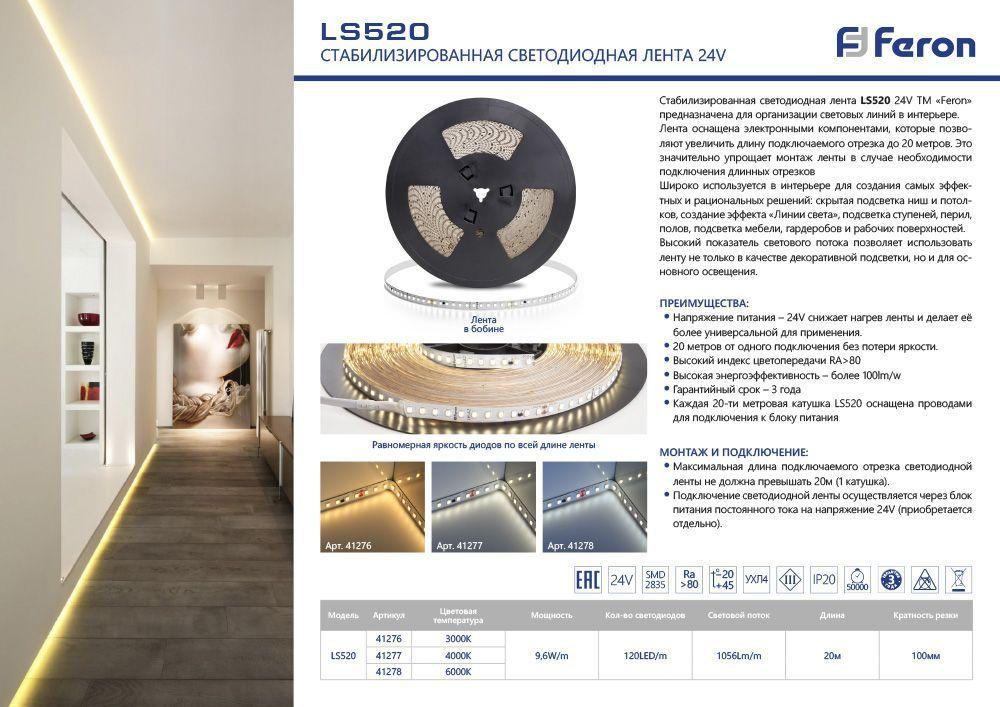 Светодиодная лента Feron 9, 6W/m 120LED/m 2835SMD теплый белый 20M LS520 41276 в Белгороде