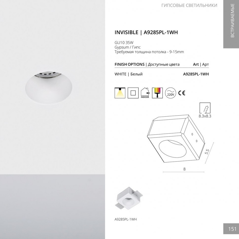 Встраиваемый светильник Arte Lamp A9285PL-1WH, входящий в серию Invisible, отлично подойдет для освещения пространства на кухне, на даче, в гардеробной, в прихожей, в кабинете, в баре, оформленных в современном стиле или в стиле Техно. Данный спот имеет один гипсовый плафон белого цвета, выполненный в форме призмы и направленный вниз, а также белую арматуру, изготовленную из алюминия. Итальянский производитель Arte Lamp дает гарантию на свое изделие 1 год и рекомендует использовать для устройства полусферические лампы с рефлектором цоколя GU10 и мощностью 35 Вт, что позволяет осветить помещение площадью 2 кв. м., при этом общий световой поток зависит от купленных ламп. Технической особенностью этого осветительного прибора является возможность диммирования освещения, при условии покупки диммируемых ламп. Анкерный способ крепления встраиваемого светильника к потолку позволяет быстро и просто осуществить монтаж спота, при этом диаметр врезного отверстия равен 83 ммх83 мм, а высота встраиваемой части составляет 55 мм . Лаконичный дизайн, матовая белая поверхность и нейтральная цветовая температура встраиваемого светильника Arte Lamp A9285PL-1WH, делают его особенным элементом декора, который украсит любое интерьерное пространство.